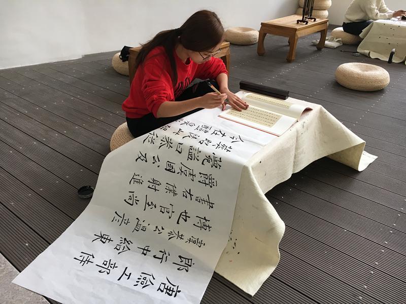 图为虞岚老师向调研员介绍文法创客空间、一院一策