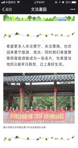 17年以来,嘉兴老虎机 的志愿者们一直希望“能在支教,关爱景南留守儿童的基础上”,助力景南自身的发展。而对景南来说,发展民宿旅游是一条出路。因此,25日前后实践团成员积极走民宿景点,跑乡政府调研,希望能够助力“景南名片”的宣传。“云间与指尖、森林氧吧、畲族风情、仁孝节、竹工艺品文化、景南民俗体验等”,志愿者们通过微信公众号、暑期投稿,让更多人知道景南,希望为景南的“名宿、民风”站台,推介“景南名片”,希望更多投资商能关注到景南,也鼓励广大旅游爱好者前来观光,希望助力景南民生、早日脱贫,过上美好生活。