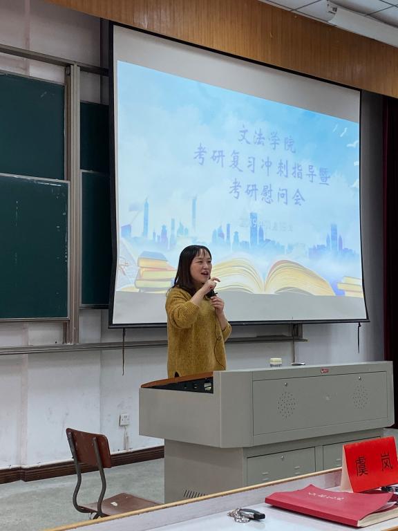 ,向考研同学发放了慰问品,也表达了最亲切的关怀。她与考研同学分享了三点希望:第一,希望同学们能够永远记得老师是你们最坚强的后盾,遇到问题时要及时和老师联系交流;第二,希望同学们在考研最后的一个月里调整好心态;第三,希望同学们注意劳逸结合。最后虞岚老师送给同学们一句话:相信自我,坚定理想,不怕苦难,顽强拼搏,并衷心祝愿同学们能够完成人生理想的抱负。
