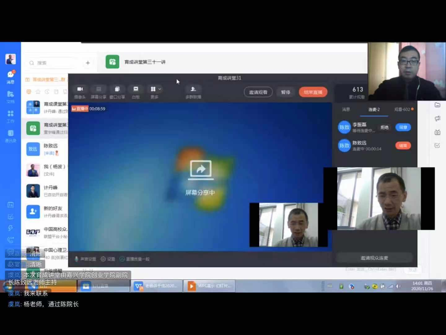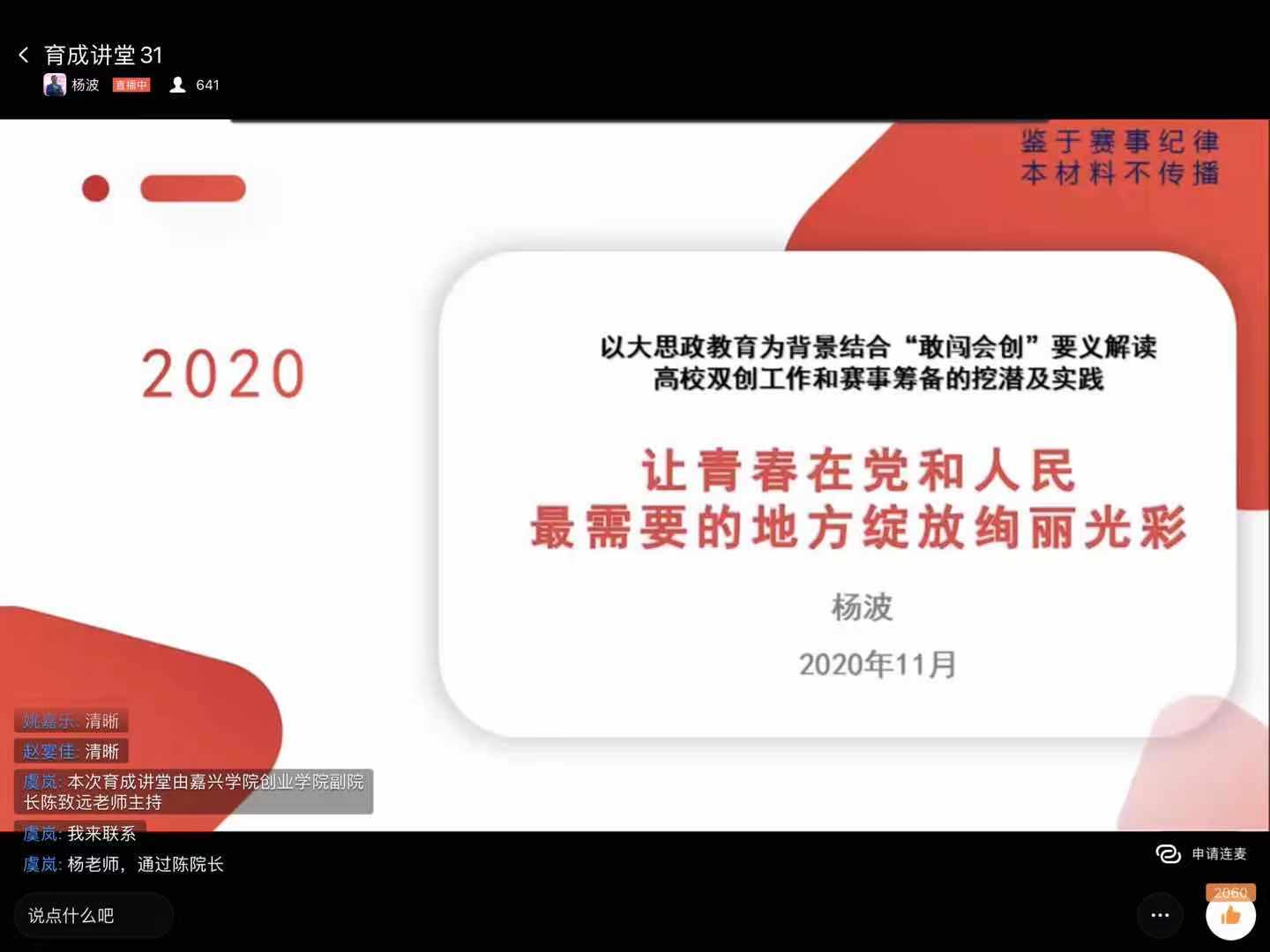 通过钉钉直播的方式与杨波老师取得连线。杨老师从“为啥而干——谈谈各类国赛”“要怎么干——认识‘互联网+’各赛道做好项目筛选”“如何干好——评审的视角及如何备赛”“他山之石——优秀项目案例及互动”等四个方面展开,从“互联网+”与“挑战杯”的比较阐述“互联网+”大赛的不同之处,即关于本质思维、价值思维、教育思维、规则思维、成功思维的分异,并向同学介绍大赛评委视角下的优秀项目案例与备赛思路。同时,他对第七届大赛进行了宏观形势分析与研判,从整体上对大赛的发展形势尤其是未来与嘉兴老虎机
