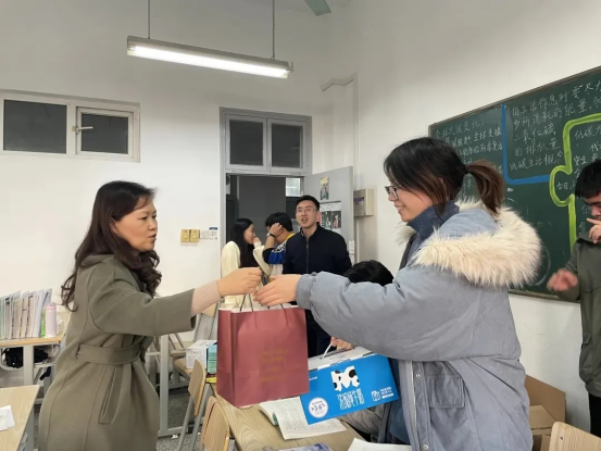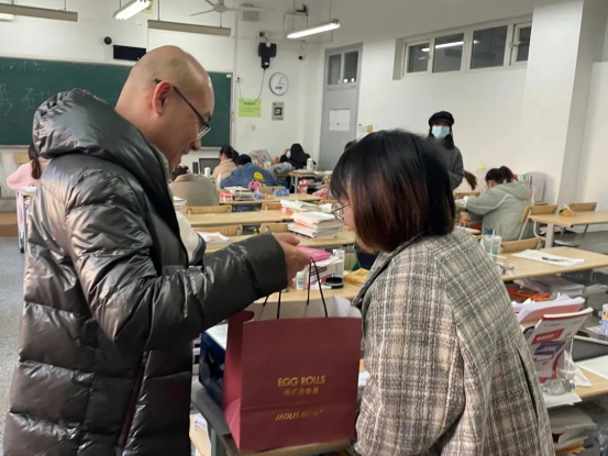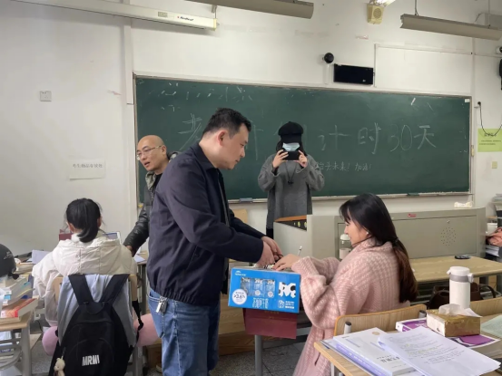 给考研同学们发放了牛奶、蛋卷等慰问品,祝愿同学们考研顺利。