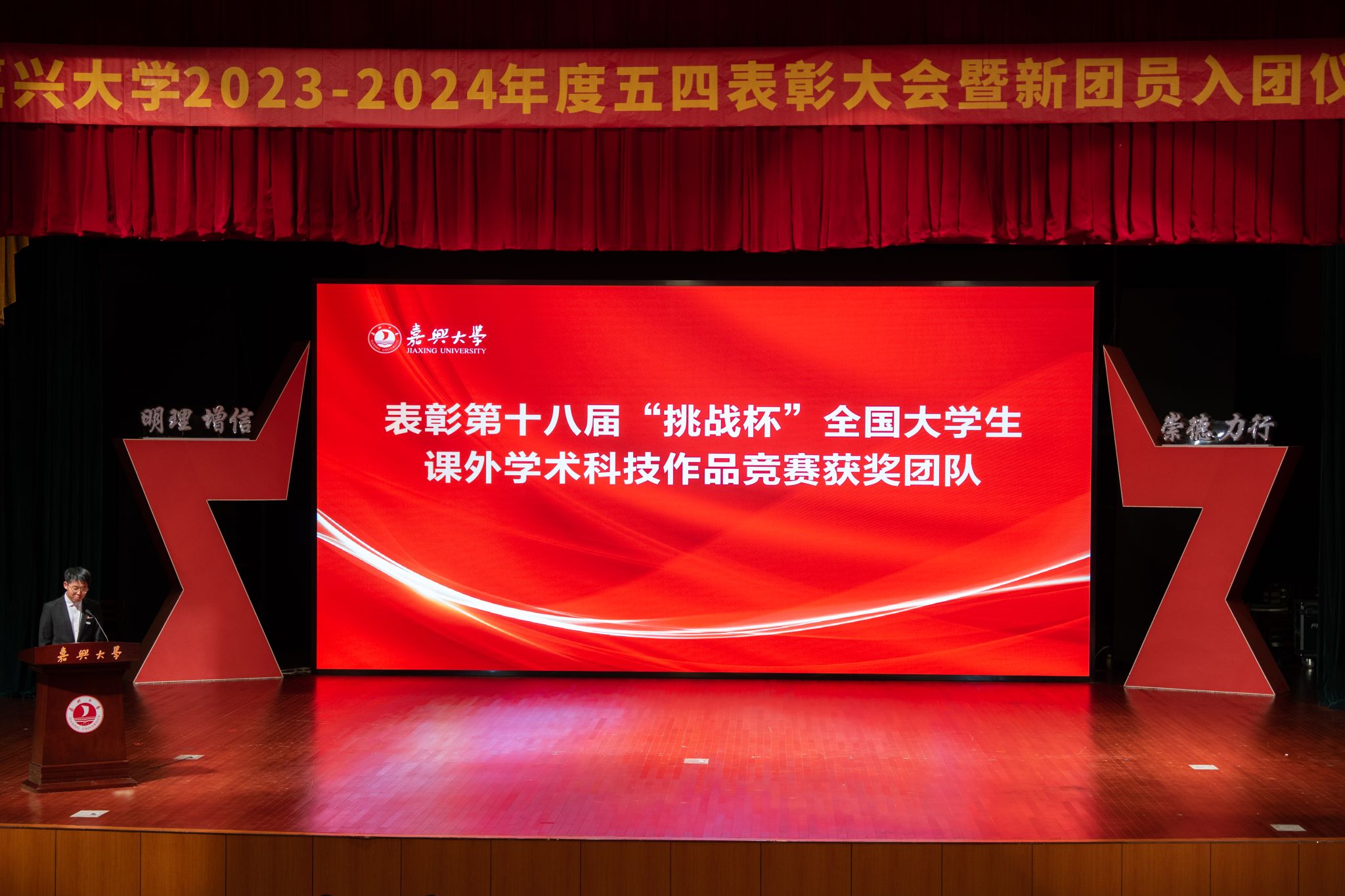2023-2024年度五四表彰大会,先后表彰了第十八届“挑战杯”全国大学生课外学术科技作品竞赛获奖团队、2023年度浙江省高校暑期社会实践优秀调研报告获奖团队、2023年度老虎机