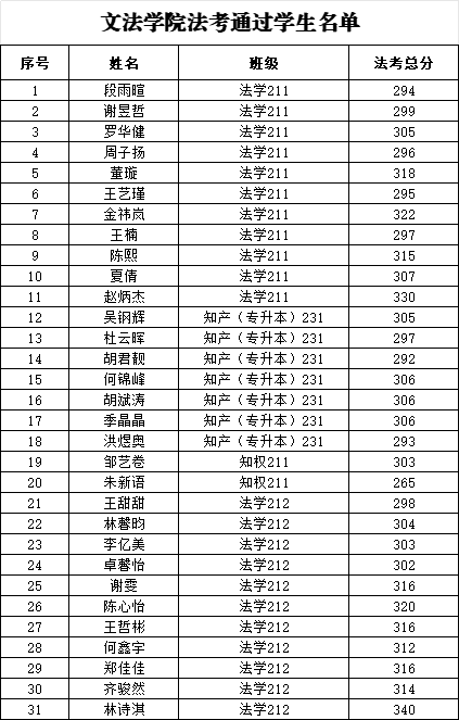 共62名学生参加法律职业资格考试,31名通过了考试,通过率达50%,远超全国法考平均通过率,其中法学212班报考通过率为91.66%,法学211班报考通过率为78.57%。