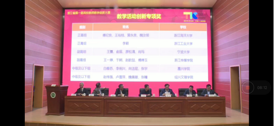 白春苏、李俐兴、向洁茹、张宇等四位老师组成的团队荣获中级及以下组特等奖和教学活动创新专项奖,并被推荐代表浙江省参加国赛。此外,在大赛的“课程思政”微课专项赛中,白春苏团队还获得了文科组二等奖。