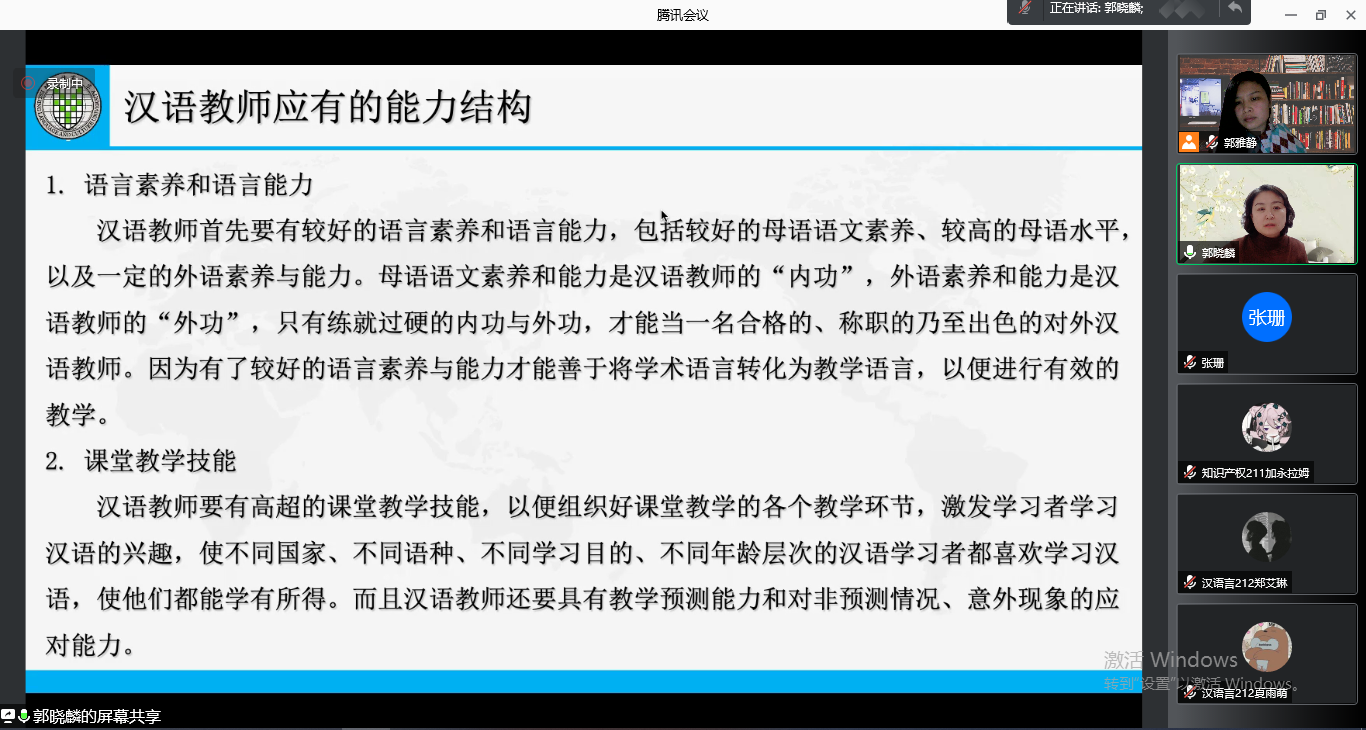 2021129日晚,《汉语教师的素养与常用教学方法》学术讲座在老虎机 成功举办。为了积极配合疫情防控工作,本次讲座通过腾讯会议平台召开。本次讲座邀请了北京语言大学博士生导师郭晓麟教授,留学生教学团队教师,汉教专业、汉语言专业和法律专业学生等70余人参加了讲座。