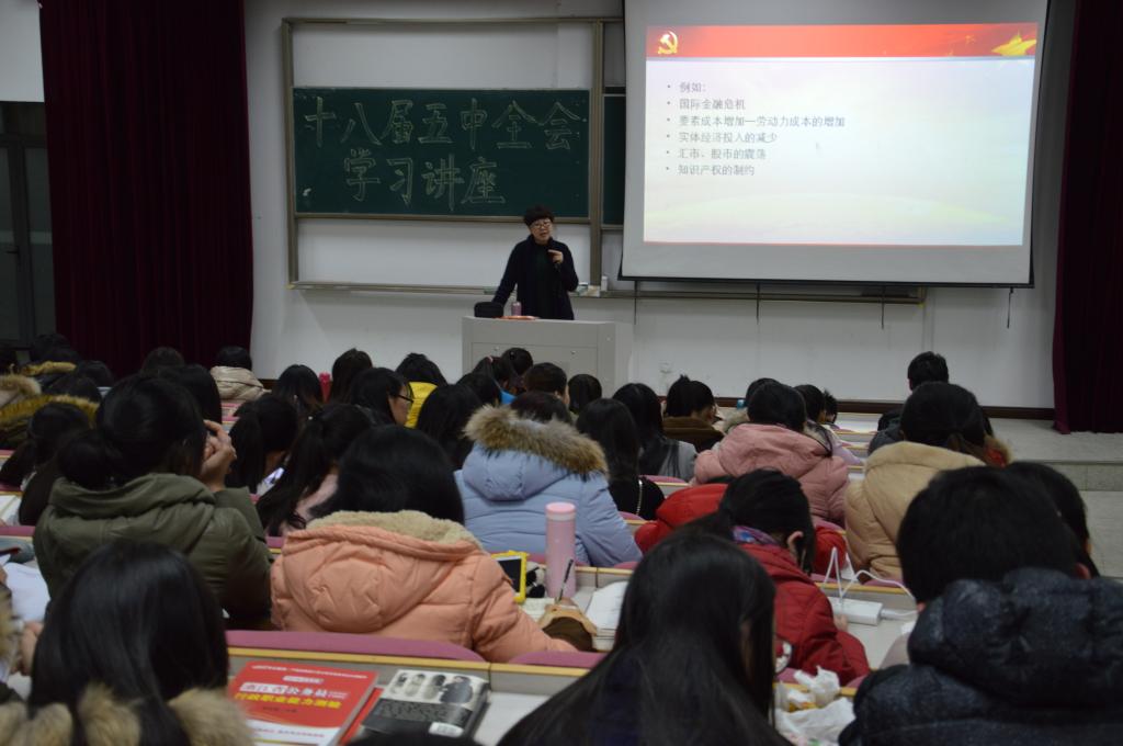 2015年12月16日,老虎机 党委在梁林校区7号楼报告厅组织学生学习十八届五中全会精神。本次学习会由学工办主任虞岚主持,老虎机 党委书记费锦红主讲。