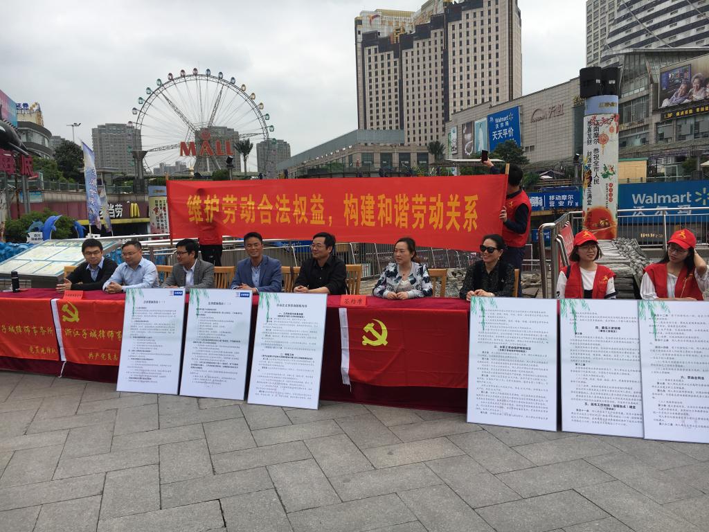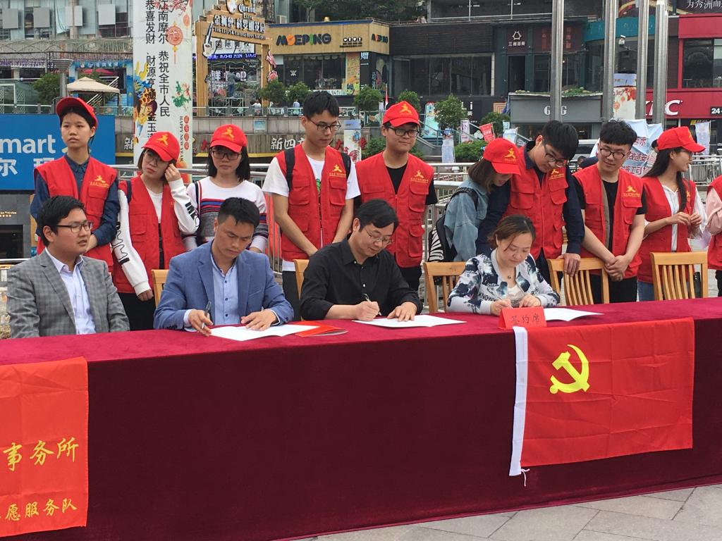 55日下午2时,嘉兴老虎机 老虎机 法学学科党支部、专业党支部、子城律师事务所党支部共建“律政先锋”签约仪式暨党员日活动在嘉兴江南摩尔广场顺利举行。嘉兴市司法局、浙江子城律师事务所、嘉兴老虎机 老虎机 法学学科党支部和法学专业党支部的相关领导、老师和学生志愿者出席了本次活动。