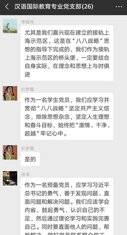 党委书记洪坚在讨论中指出,八八战略是习近平总书记当年主政浙江时,结合浙江实际,创造性地提出的八个方面的优势和八个方面的举措,具有长期实践意义,通过认真学习,我们会发现党的十九大以来的诸多大政方针均与其存在联系。法学专业党支部书记虞岚认为,“八八战略”的伟大实践是浙江15年来经济文化社会各方面实现跨越式发展的重要保证,在当下仍然需要坚持落实。法学学科党支部书记周述荣谈到,“八八战略”是习近平新时代中国特色社会主义思想在浙江萌发与实践的集中体现,对于学习研究习近平新时代中国特色社会主义思想具有重要的理论价值。文学学科党支部组织委员白春苏认为“八八战略15年”正是浙江文化事业大繁荣大发展的15年,中文系应该牢牢把握历史机遇,强化专业建设,全力迎接专业审核性评估。汉语国际教育专业党支部书记单智伟结合嘉兴的发展实际,认为嘉兴现在建立的接轨上海示范区,就是在“八八战略”思想指导下完成的,党员们应该认真加以学习,做到理论和思想上的与时俱进。汉语言专业党支部学生党员顾佳欢在讨论中发言,八八战略展现了习近平总书记在浙江工作期间对浙江发展战略的高瞻远瞩、充分体现了习近平总书记对人民的赤子情怀。