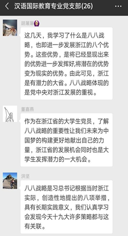 各基层党支部师生党员观看学习了“八八战略15年”政论纪录片和视频短片,重温“八八战略”的伟大战略思想,深刻感悟习近平新时代中国特色社会主义思想在浙江大地的萌发与实践,并在网上展开了热烈的讨论。