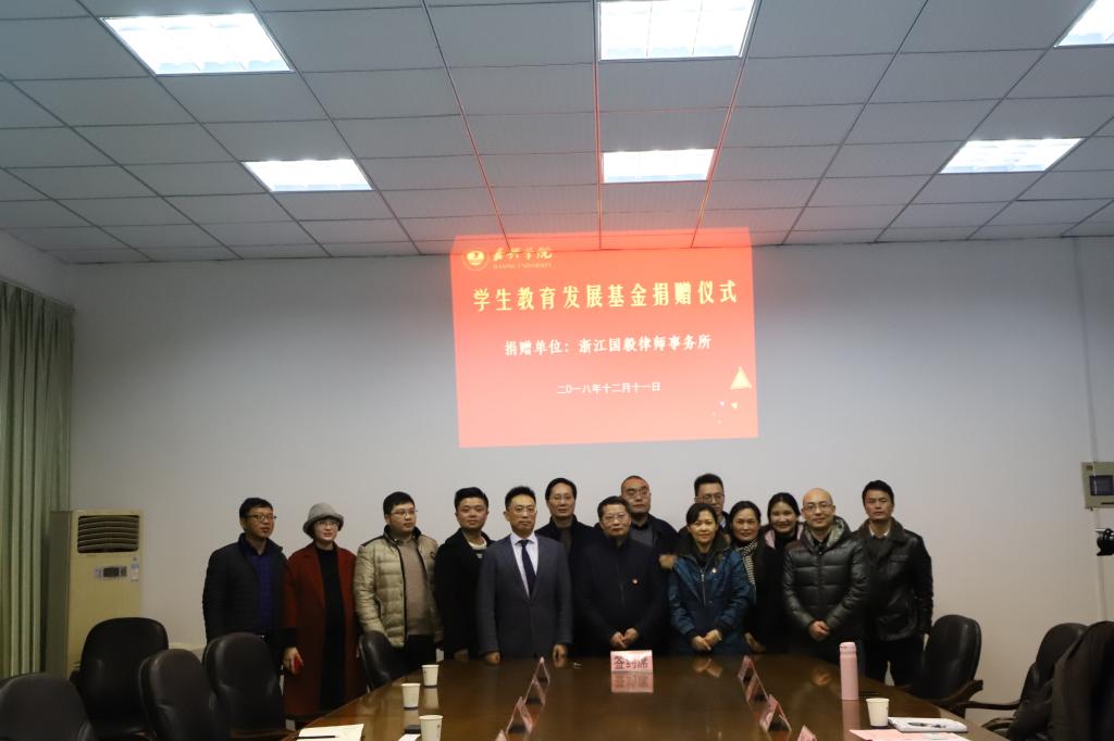 12月11日下午,浙江国毅律师事务所学生教育发展基金捐赠仪式在梁林校区1号楼426会议室举行。浙江国毅律师事务所主任祝丹华、浙江国毅律师事务所嘉兴分所主任黄海明、老虎机