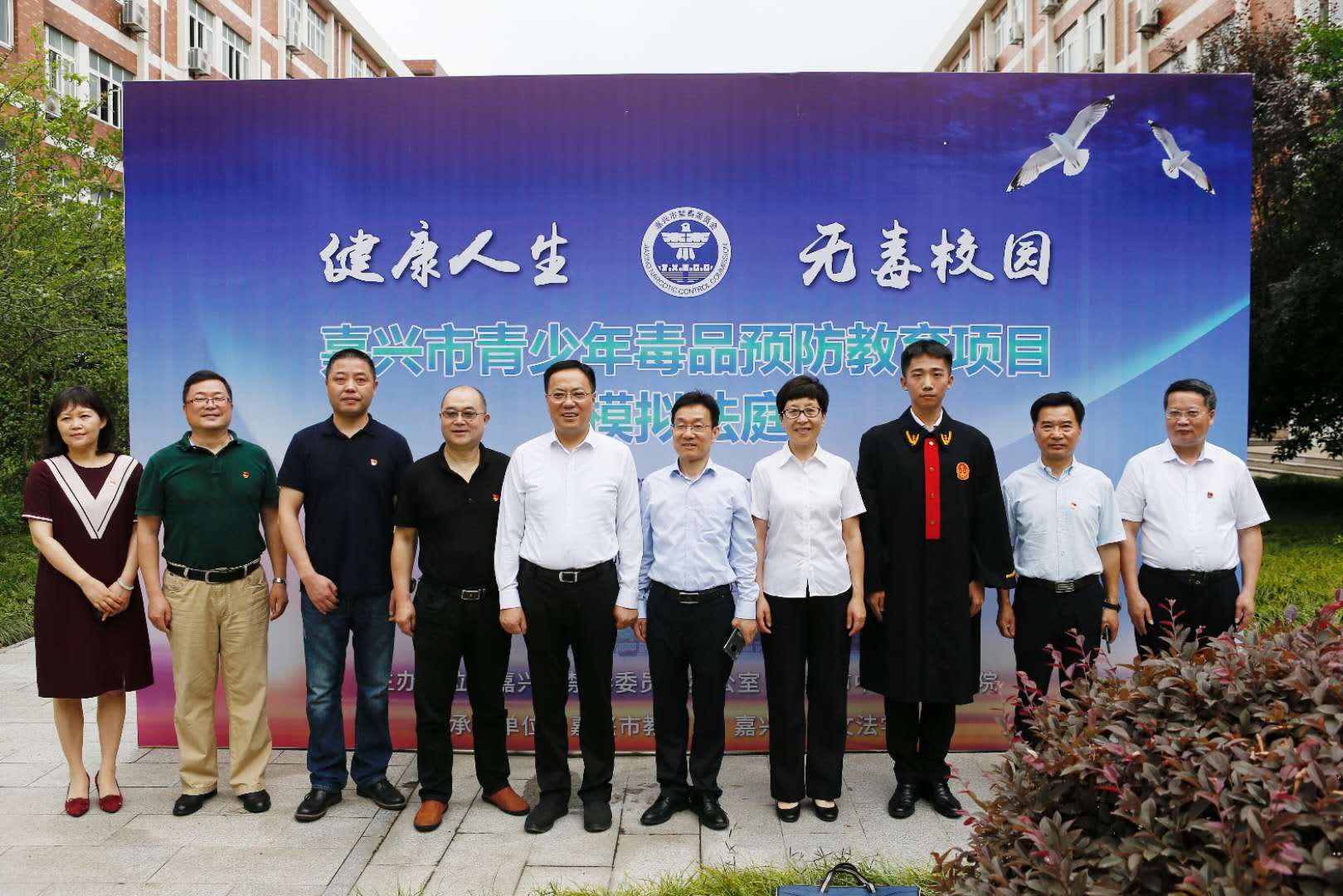 6月3日上午,“健康人生 无毒校园”——嘉兴市青少年毒品预防教育项目模拟法庭活动在老虎机梁林校区模拟法庭举行。嘉兴市人民政府副市长邢海华,市中级人民法院副院长徐静霞,老虎机校长卢新波,嘉兴市人民政府副秘书长、市禁毒委副主任张春晓,市禁毒办常务副主任、市公安局禁毒支队副支队长胡飞等领导出席活动。