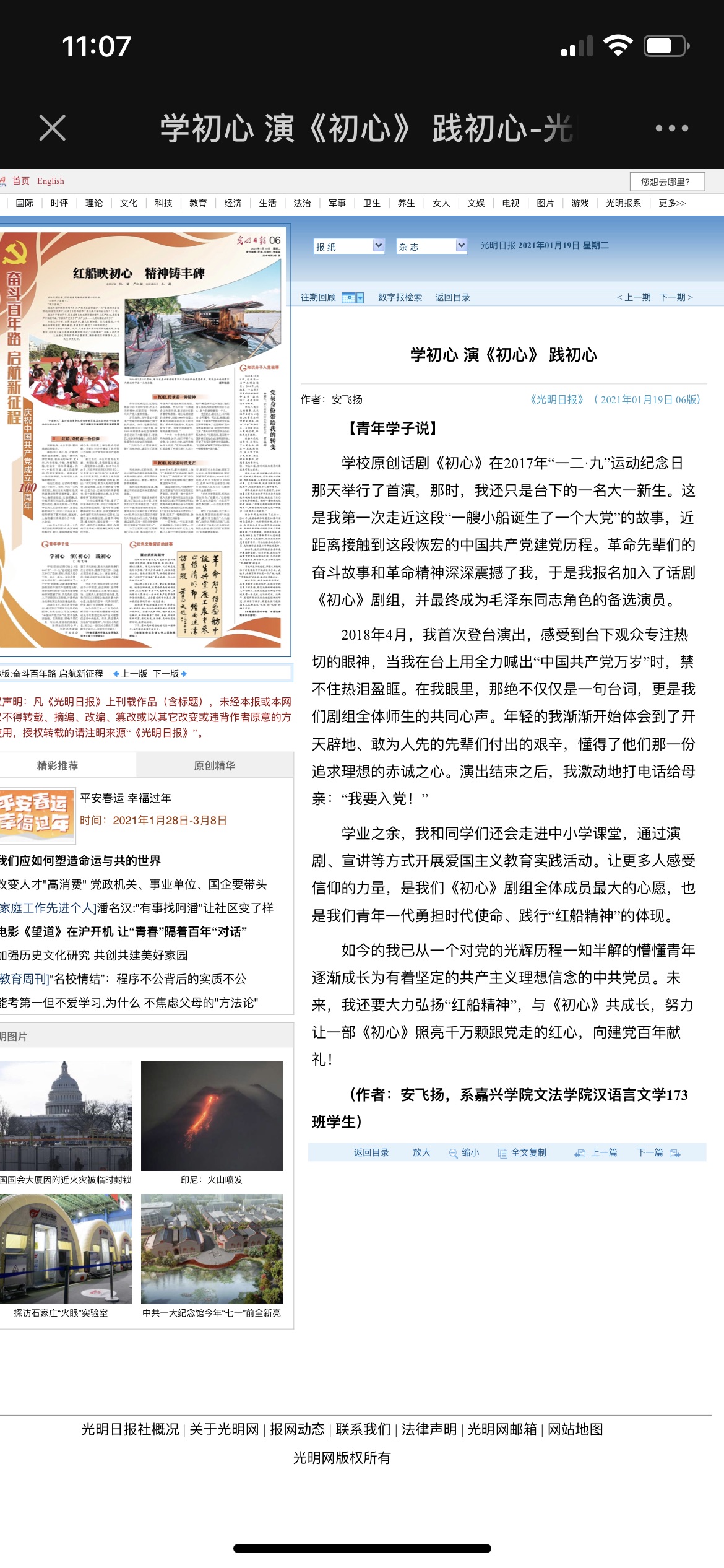 2021年1月19日,老虎机 汉语言文学173班安飞扬同学在《光明日报》上发表名为《学初心 <演初心> 践初心》的文章。文章描述了安飞扬同学在饰演原创红色话剧《初心》中毛泽东同志时被红船精神所震撼,从一个对党的光辉历程一知半解的懵懂青年成长为有着坚定的共产主义理想信念的中共党员的历程,展现了新时代青年勇担使命的优秀形象。