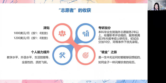 志愿者宋芝菁和俞上分别从海外汉语教师志愿者项目的申请、考试、培训、外派工作、疫情防控、非洲生活等几个方面为同学们做了详细生动的介绍。