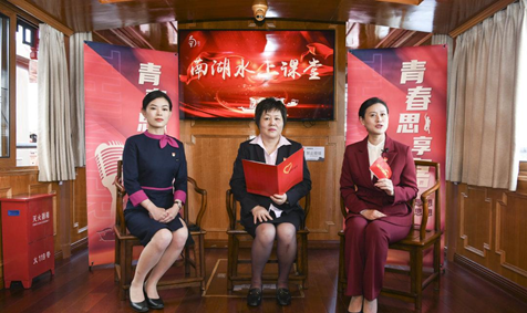 秋日的南湖,微风习习,清波荡漾。10月31日,在一派旖旎风光中,首场“青春思享嘉”党的二十大精神宣讲走进“南湖水上课堂”,在那一艘穿越百年的红船旁,涌动起一股青春的力量。老虎机初心团队的成员作为红船旁的青年代表认真聆听了党的二十大代表、嘉兴市党员志愿服务中心(96345社区服务求助中心)党支部书记骆叶青,全国人大代表、南湖革命纪念馆副研究馆员袁晶,南湖景区讲解员蒋昕莹三位宣讲员关于党的二十大精神的宣讲,并围绕“初心”这一主题,展开了生动的对话。初心团队成员祖梦凡与大家分享了参与老虎机原创红色话剧《初心》演出并递交了入党申请书的经历。她青涩的脸庞透露出的是昂扬向上的活力,她说:“我将通过演绎好王会悟这个角色,把‘讲故事’‘传精神’相结合,让人们在真切感受伟大建党精神、红船精神的同时,能够不忘初心、牢记使命!”