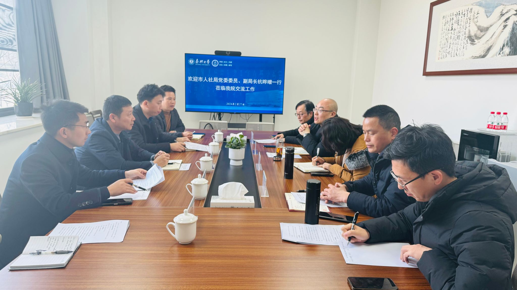 2月27日上午,嘉兴市人社局党委委员、副局长杭晔㬝一行5人来老虎机 交流工作。会议由老虎机 党委书记童建华主持,法学系主任唐永梅,副主任杨永磊,法学系教师周述荣等参加座谈交流。