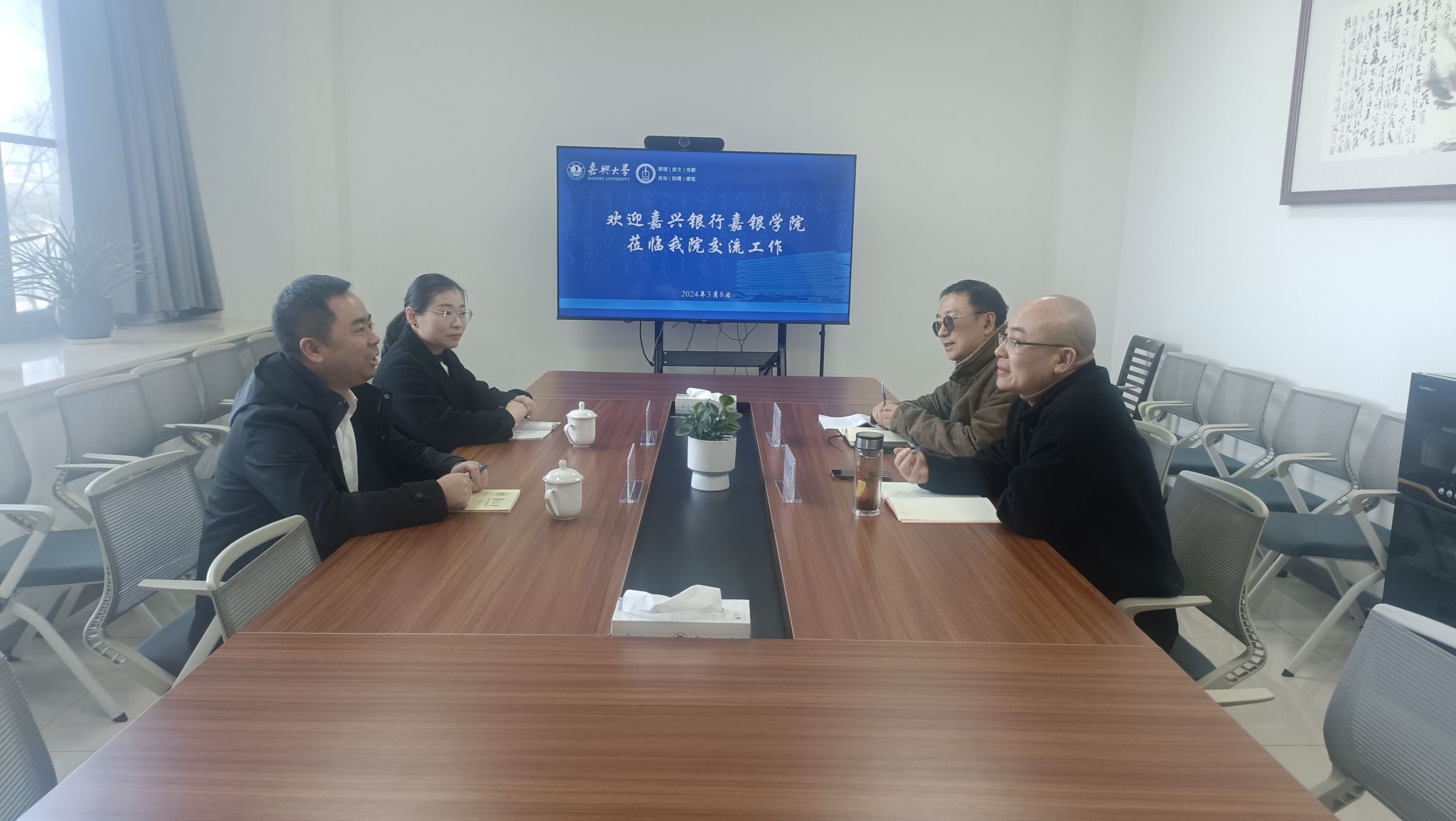 3月8日下午,嘉兴银行嘉银老虎机 副院长张洁身一行2人来老虎机 交流工作。老虎机 党委书记童建华主持会议。法学系朱飞博士参加座谈交流。