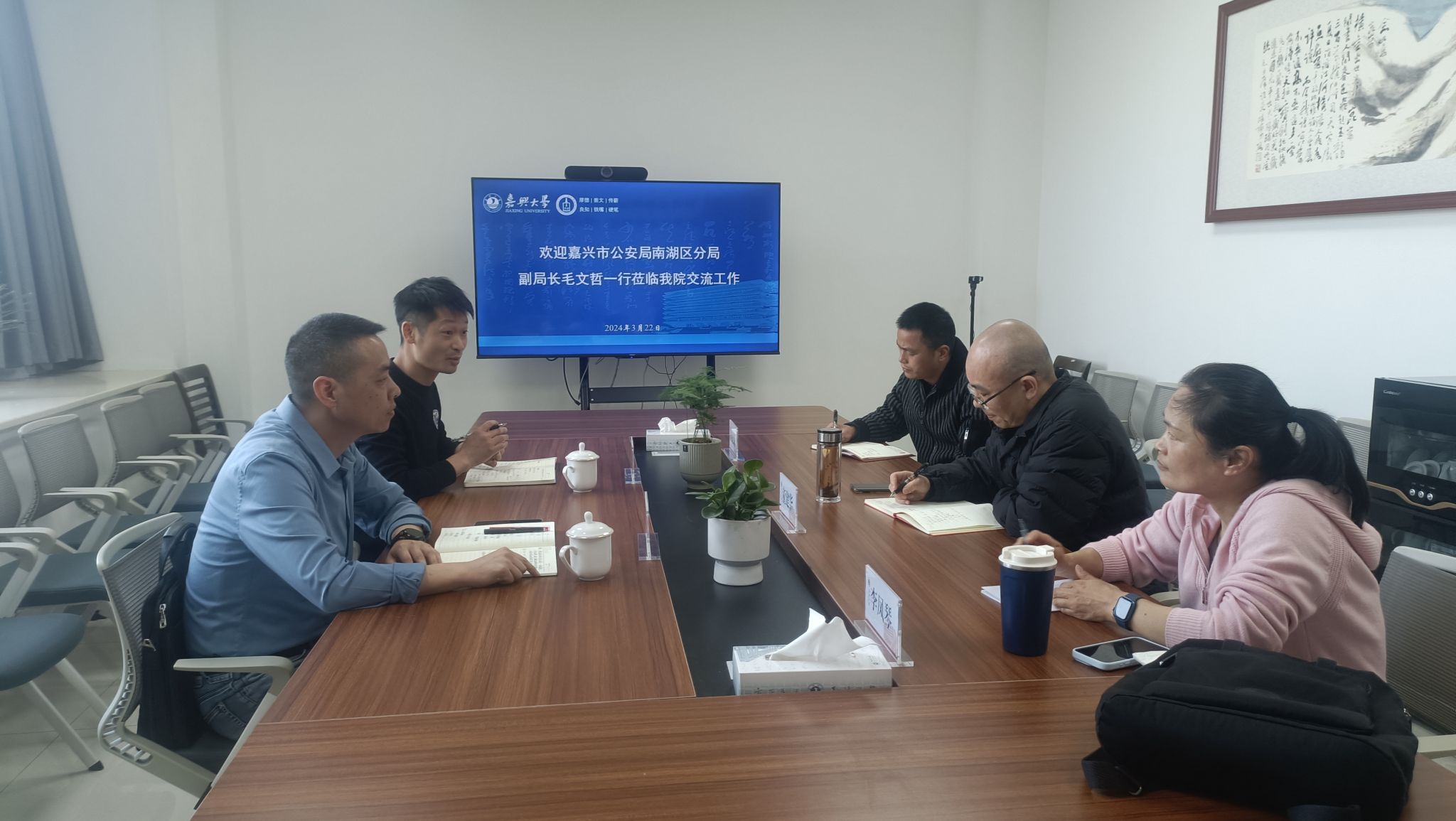 3月22日下午,嘉兴市公安局南湖区分局副局长毛文哲一行2人来老虎机 交流工作。老虎机 党委书记童建华主持会议。法学系李凤琴副教授、周述荣博士参加座谈交流。