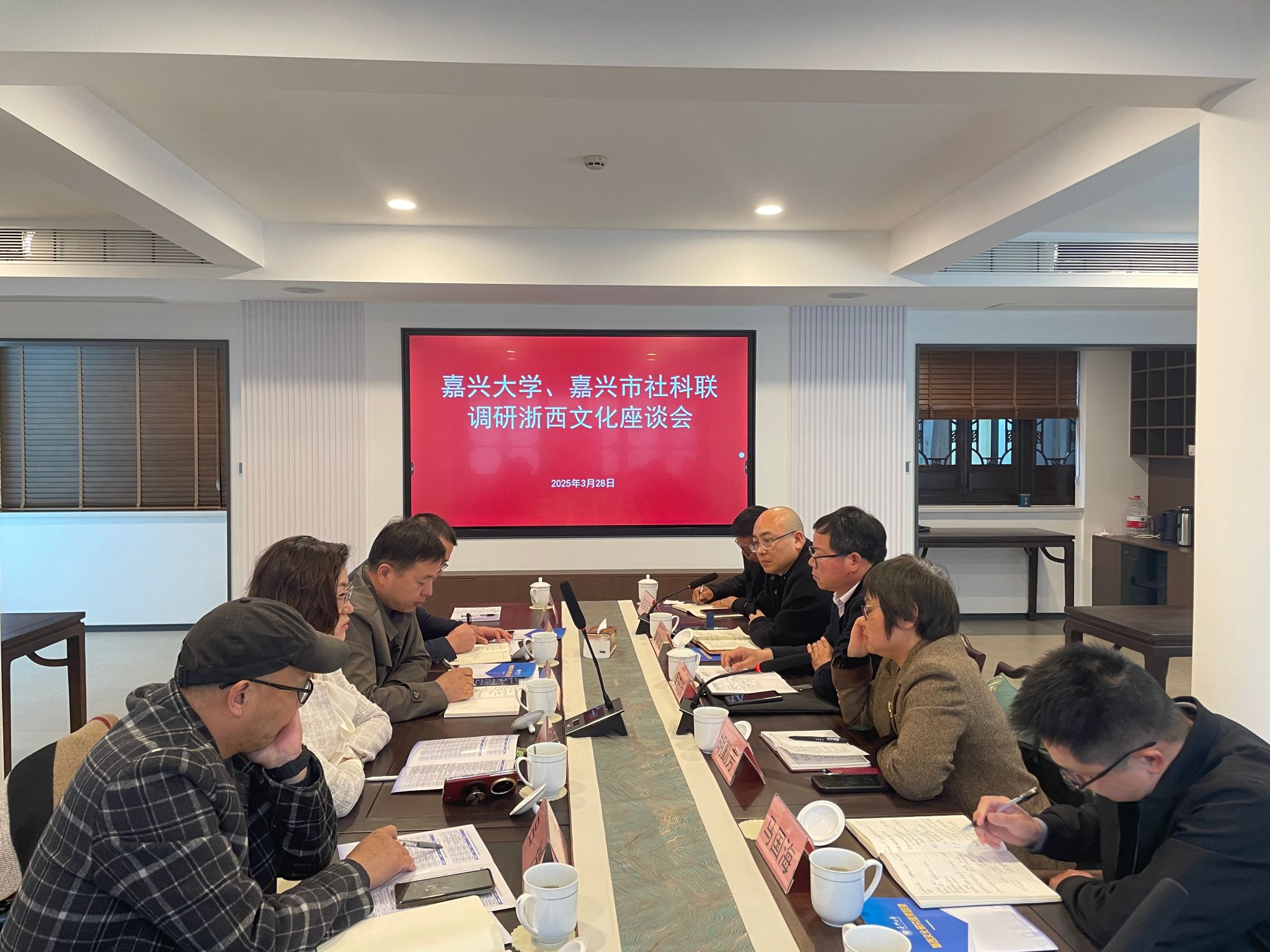 参观结束后,调研团队在茅盾纪念馆与桐乡市社科联相关负责人及当地文化专家举行座谈。桐乡市社科联领导和当代文化专家系统介绍了近年来桐乡在浙西文化研究领域取得的成果,包括《乌镇志》《桐乡历史文化丛书》等文献编纂成果,并指出辅广、吕留良等历史名人的研究有待进一步挖掘。