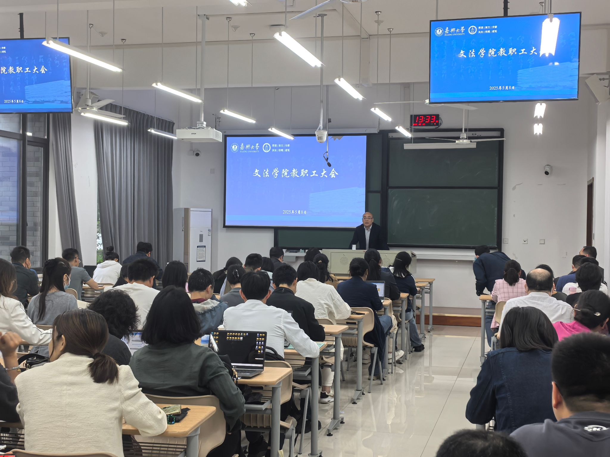 全体教职工参加,党委书记童建华主持会议。