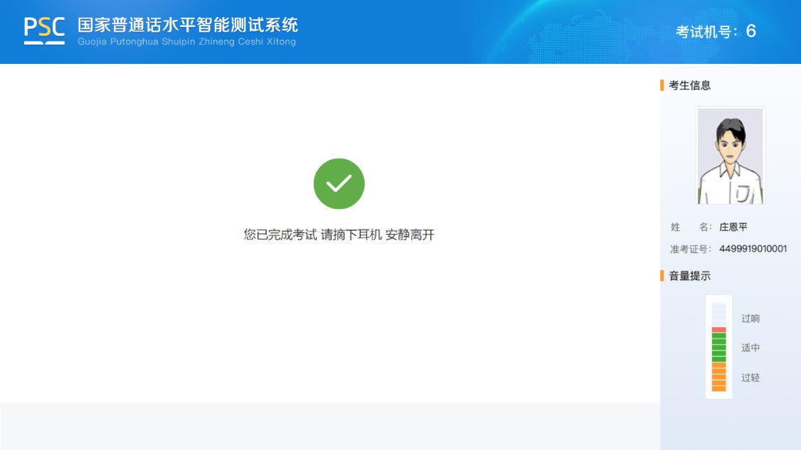 (十一)系统提示“您已完成考试,请摘下耳机,安静离开”。若提示其他信息,请及时和现场工作人员反映。