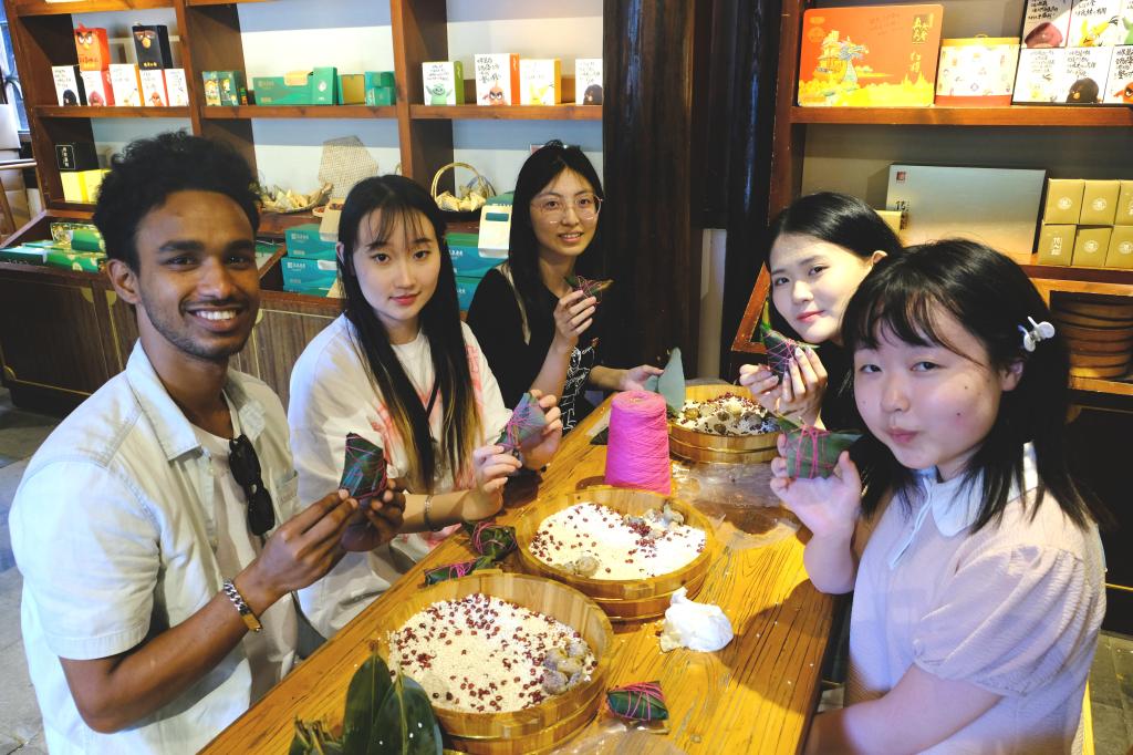 6月8日下午,国际教育老虎机 、国情教育工作室、老虎机 学生党员代表以及国际学生参加了国际学生社会实践基地揭牌仪式。初心工作室党员陈湘怡、入党积极分子王含雪与留学生们一起参观了粽子文化博物馆,了解了中国粽子文化的传承与发展。在工作人员的指导下,体验了中国非遗文化,现场进行了粽子制作体验、品尝传统特色粽子。