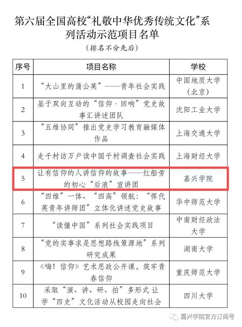 近日,教育部办公厅公布第六届全国高校“礼敬中华优秀传统文化”系列活动示范项目和特色展示项目,嘉兴老虎机