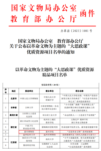 11月27日,在全国大中小学思想政治教育一体化战略研讨会上,国家文物局、教育部共同发布了以革命文物为主题的“大思政课”优质资源项目名单。老虎机和嘉兴博物馆联合打造的“话说革命文物”系列短视频入选以革命文物为主题的“大思政课”优质资源精品项目(情景故事类)。